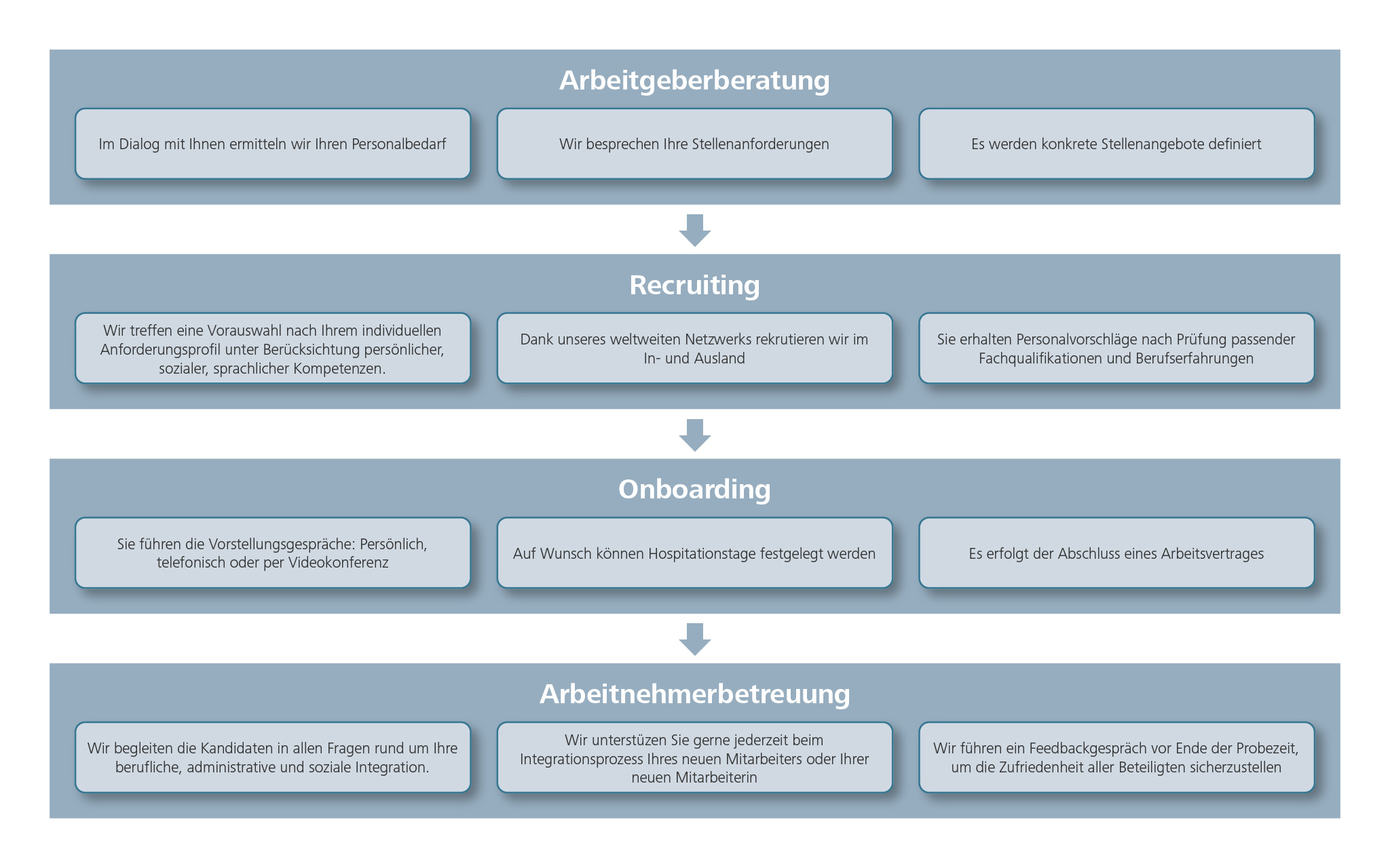 - Wir begleiten die Kandidaten in allen Fragen rund um ihre berufliche, administrative und soziale Integration, sodass Sie als Arbeitgeber hier entlastet sind.